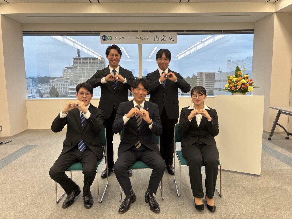 内定式の最後にはアップデートのロゴを表現したUDポーズで集合写真を撮影。みんな良い笑顔!