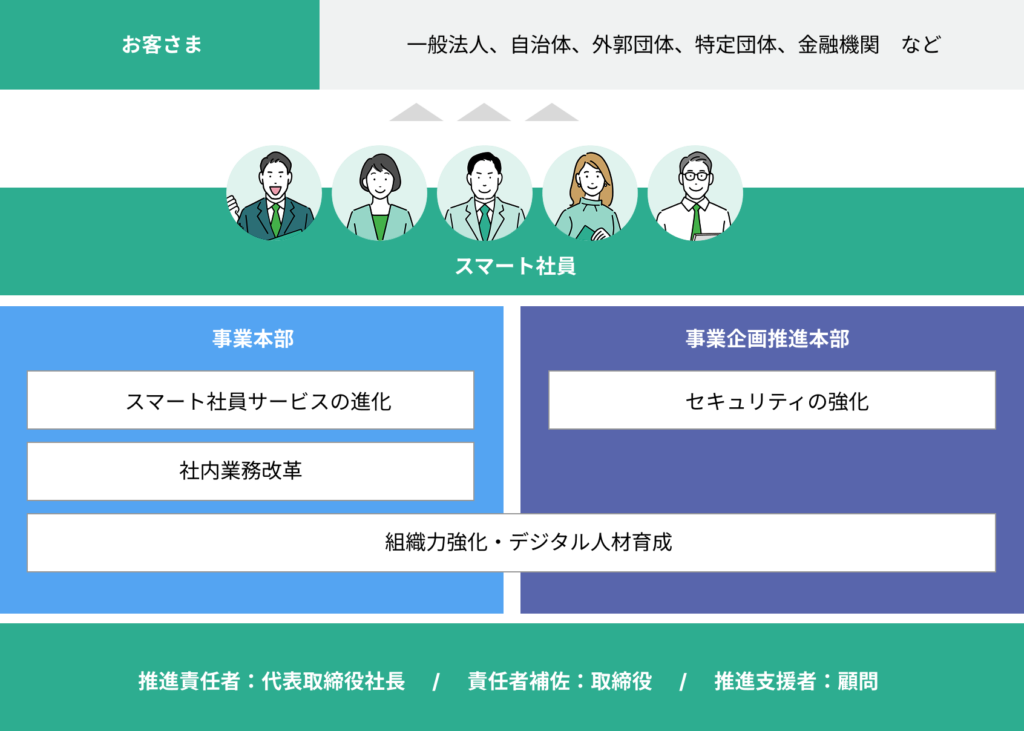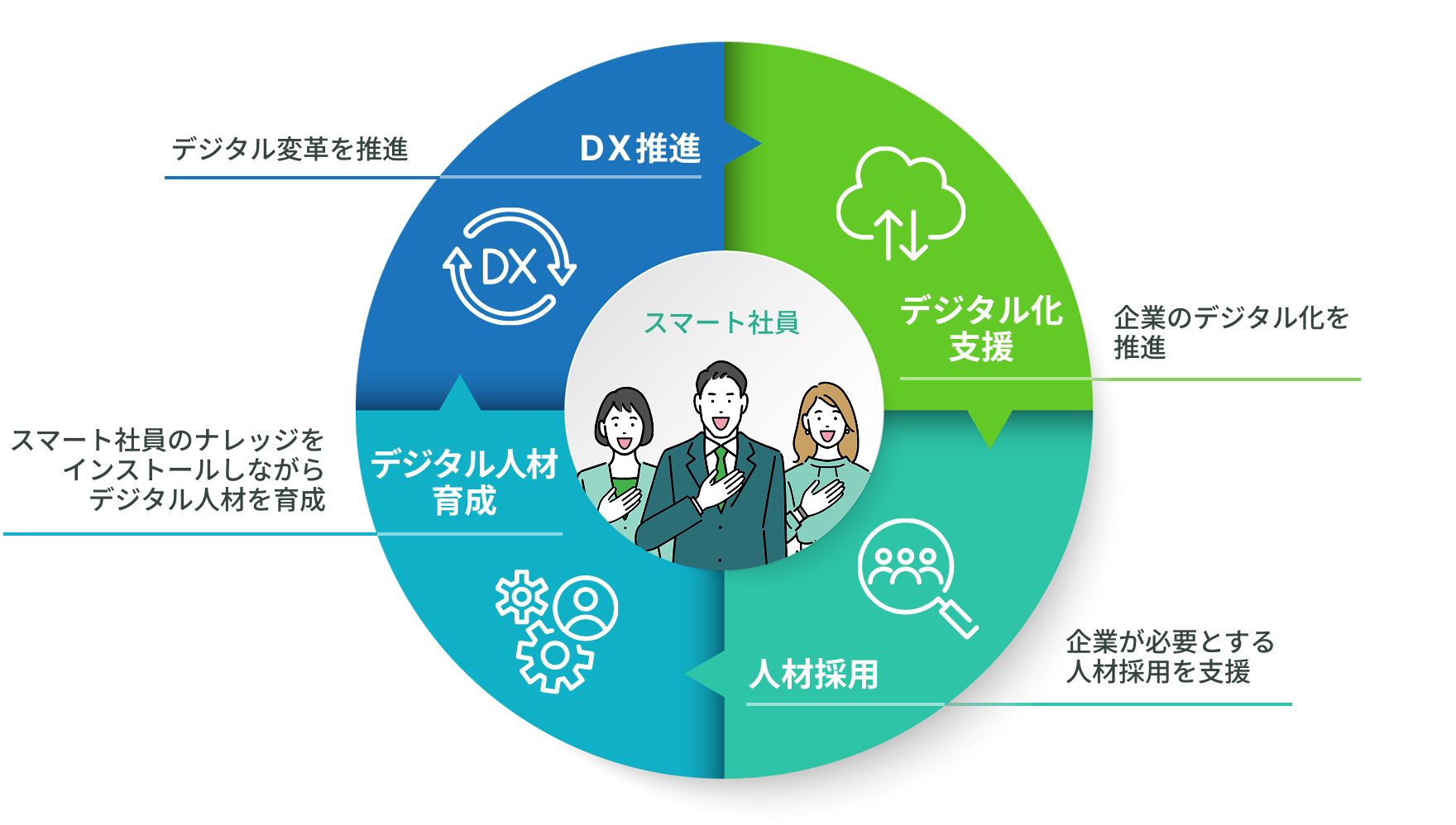 スマート社員は、DX推進の基盤を整備するとともに、業務変革に必要な人材の採用を支援します。